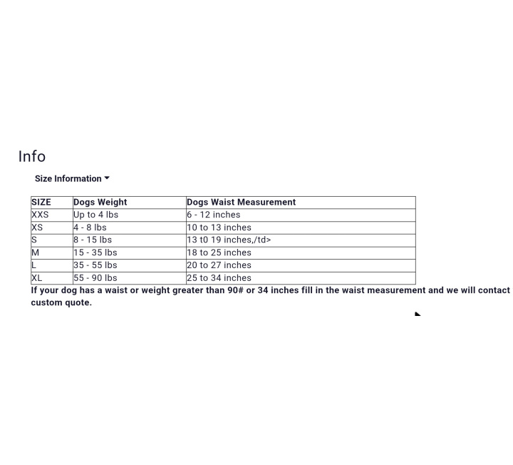 If your dog weighs more than 90 lbs or a waist greater than 34 inches email us and we will give you a custom quote. custserv@doggiesupplystore.com |